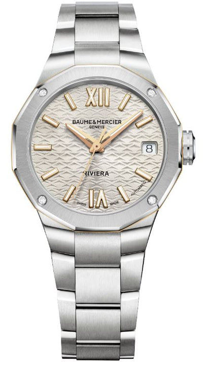 En 2023, Baume & Mercier dévoile le nouveau modèle phare de la collection : la Riviera M0A10730, véritable halo de lumière. La chaleur de son cadran doré soleil, ses vagues de transfert transparentes et son rayonnement solaire donnent une forme sculpturale aux chiffres romains, aux index rivetés revêtus de Superluminova (C1, éclat bleu) et aux aiguilles dorées facettées qui indiquent les heures, les minutes et les secondes. La date apparaît dans un guichet discret à 3 heures. L'élégance de ce garde-temps, qui fascine de jour comme de nuit, est exaltée par quatre diamants taille brillant (Top Wesselton, qualité VS, 0,05 ct) qui sont sertis dans la lunette en acier inoxydable poli et dans le boîtier dodécagonal en satin soleil.