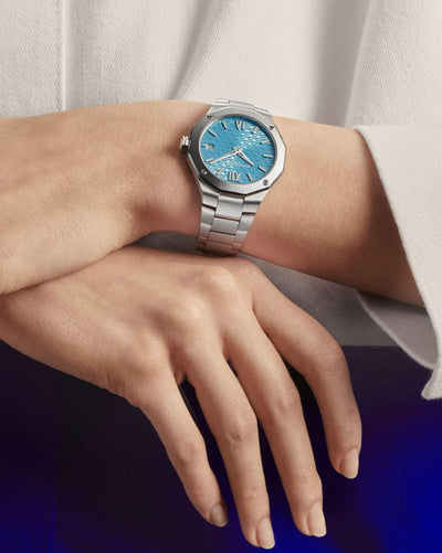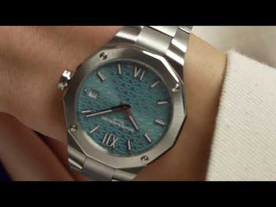 Animée par un mouvement à quartz "Swiss Made", cette Riviera est ornée d'un cadran bleu azur et montée sur un bracelet en métal donnant un aspect léger à ce garde-temps. Recommandée pour les personnalités affirmées.