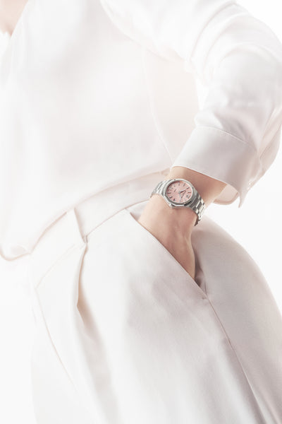 33mm stainless steel case, quartz movement with date function, sun-ray finished pink dial, stainless steel bracelet.