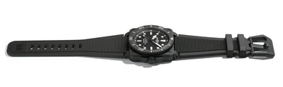 Boîtier de 42 mm en céramique noire mate, mouvement automatique, cadran noir, bracelet en caoutchouc noir avec bracelet supplémentaire en tissu noir.