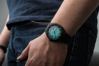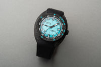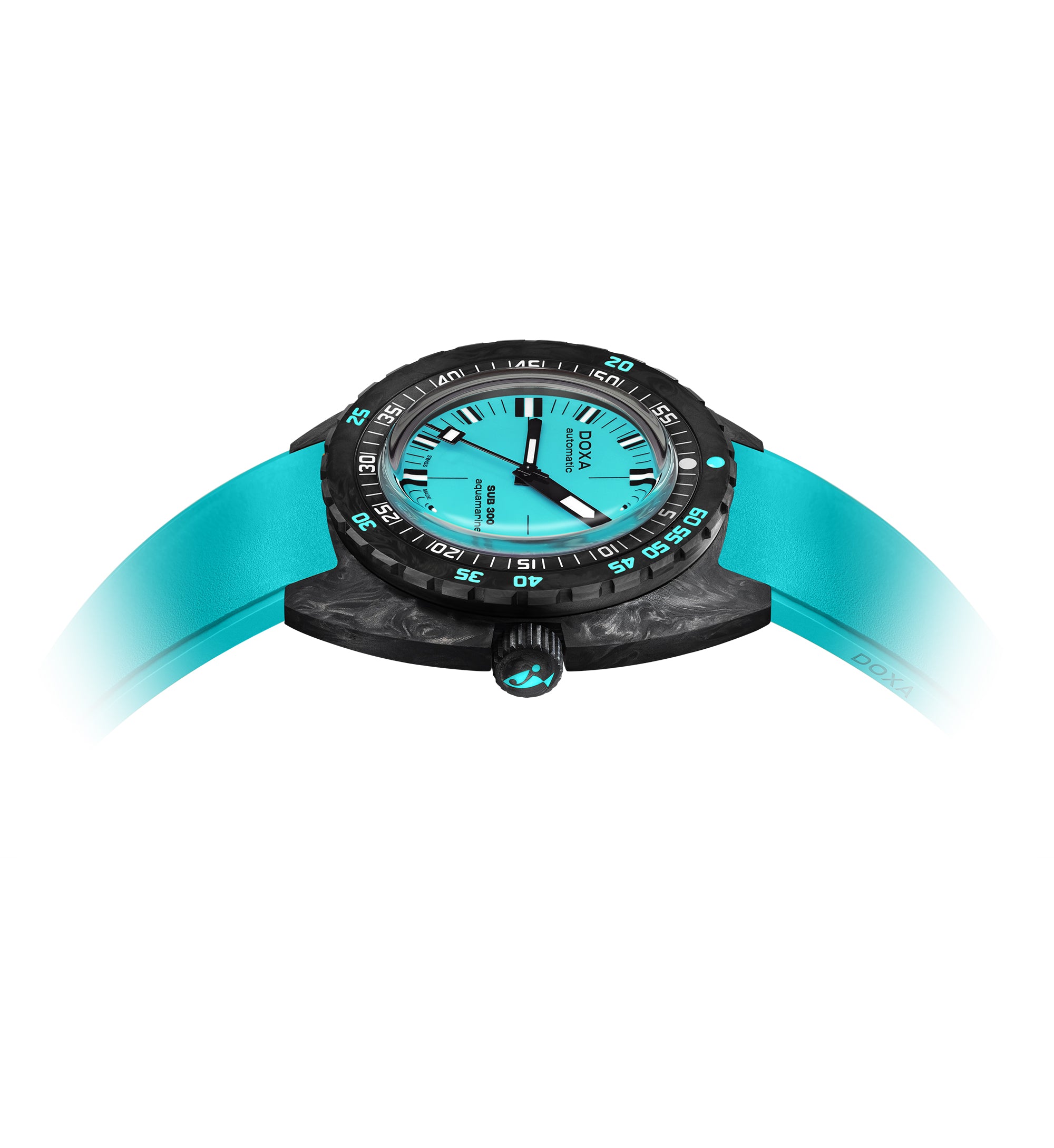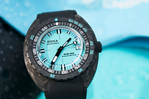The SUB 300 in carbon is available in 8 colours with the choice of a rubber strap in black or in the same colour as the dial. Featuring distinctive DOXA cues on both sides, the strap is fitted with a black PVD-treated folding clasp decorated with the exclusive DOXA fish symbol. It also has an adjustable diving extension to accommodate the thickness of a wet suit.