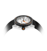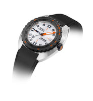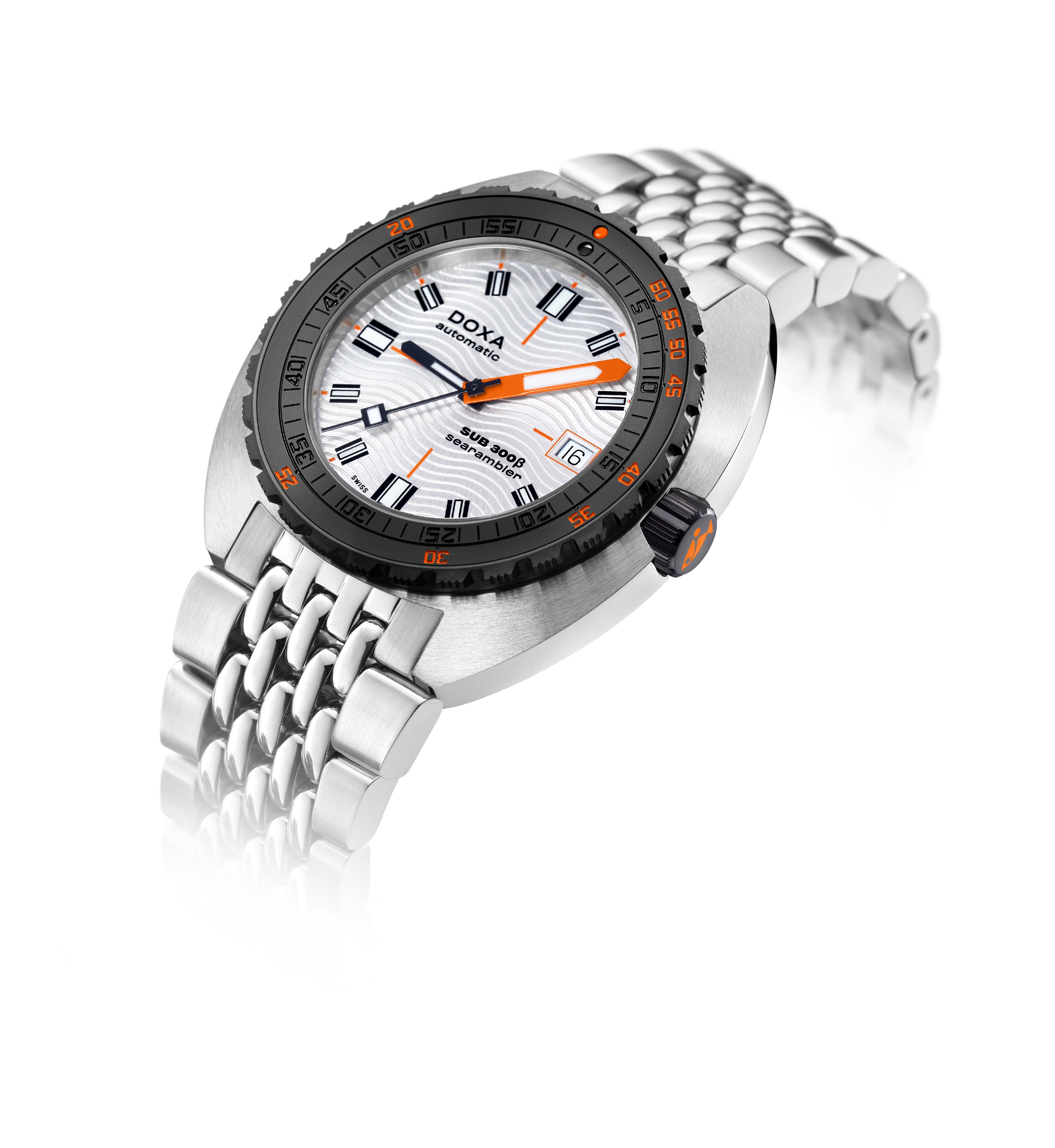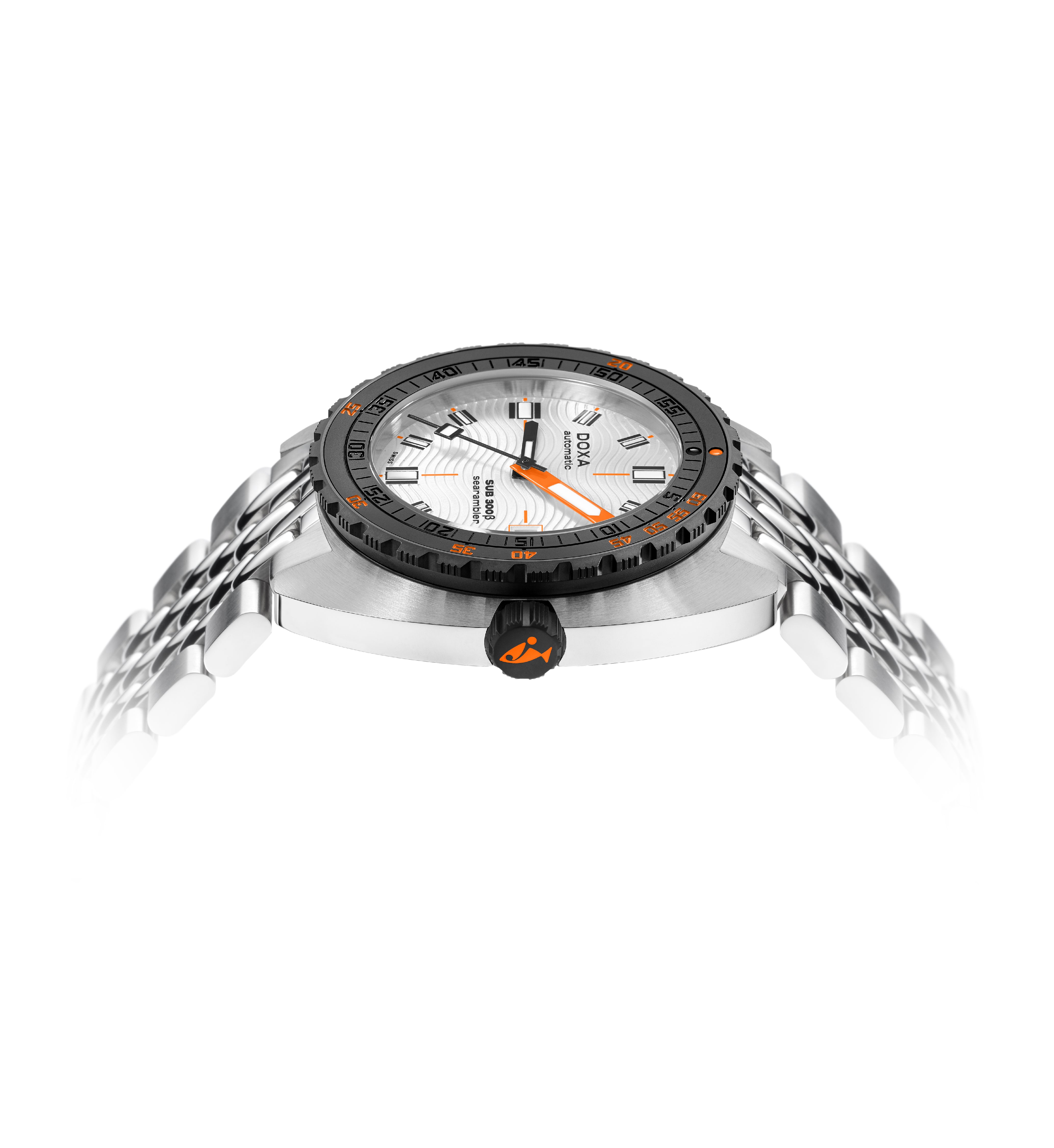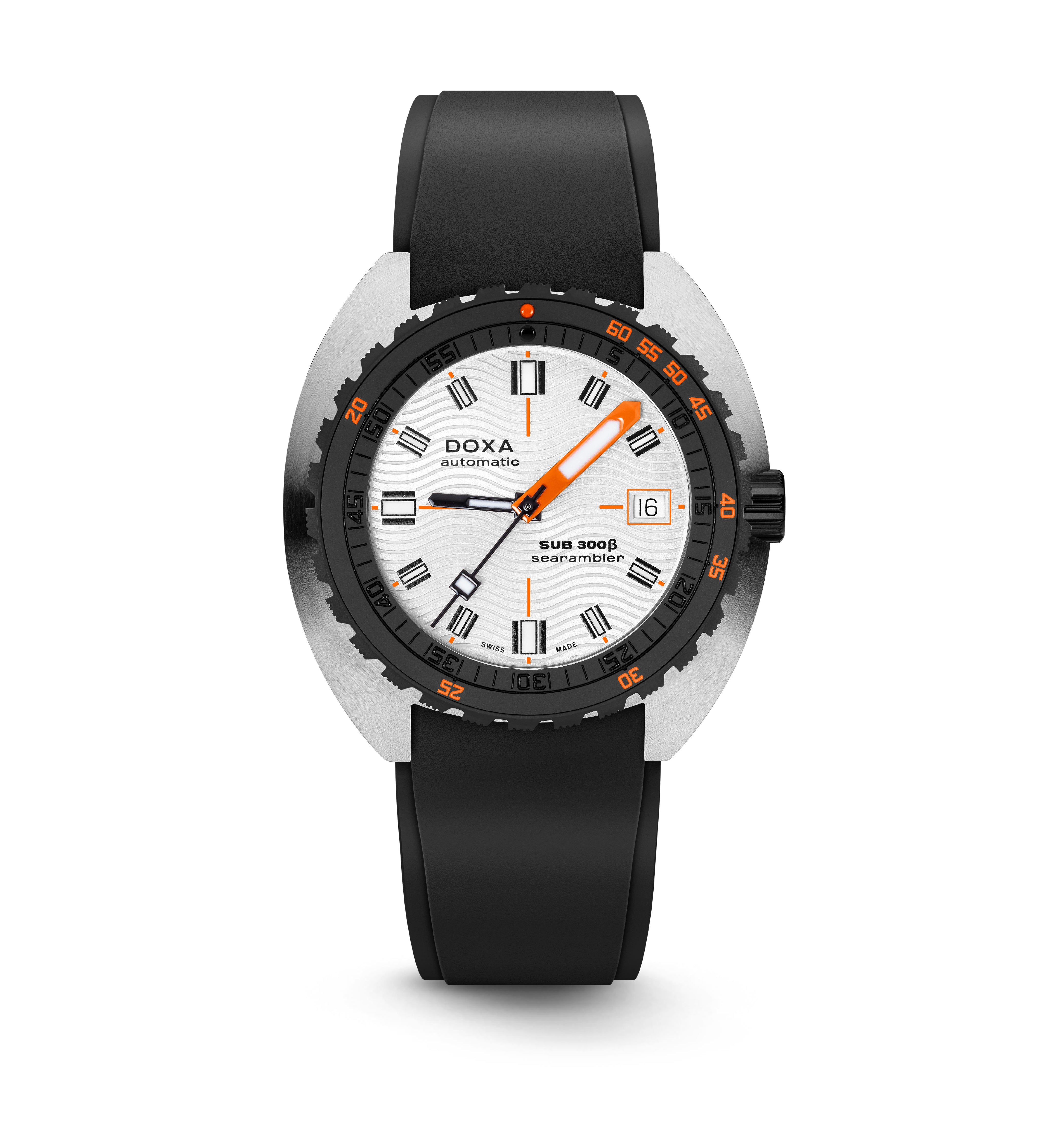 The SUB 300β sports watch combines functionality with style, maintaining foundational tool watch features in a redesigned 42.5 mm diameter case, now slimmer at 11.95 mm. The black ceramic bezel and screw-down crown enhance its sport-chic character, complemented by a sophisticated sunburst dial finish. Available with an FKM rubber strap or stainless-steel "Beads of Rice" bracelet, both featuring a ratcheting folding clasp, the watch is water-resistant up to 300 meters. With a scratch-resistant sapphire crystal, Swiss automatic movement, and a power reserve of around 38 hours, the SUB 300β is engineered for safety and exploration. True to DOXA's unconventional ethos, it blends the spirit of the times with an elegant, modern sport-chic look suitable for urban settings.