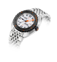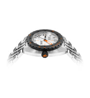 42.5mm stainless steel case, automatic movement, silver dial with orange accents.