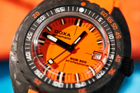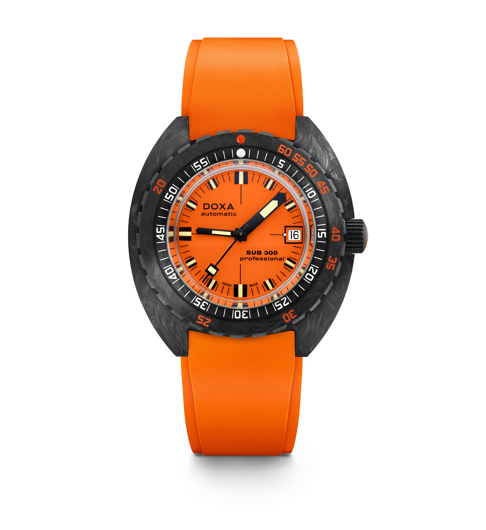 The SUB 300 in carbon is available in 8 colours with the choice of a rubber strap in black or in the same colour as the dial. Featuring distinctive DOXA cues on both sides, the strap is fitted with a black PVD-treated folding clasp decorated with the exclusive DOXA fish symbol. It also has an adjustable diving extension to accommodate the thickness of a wet suit.