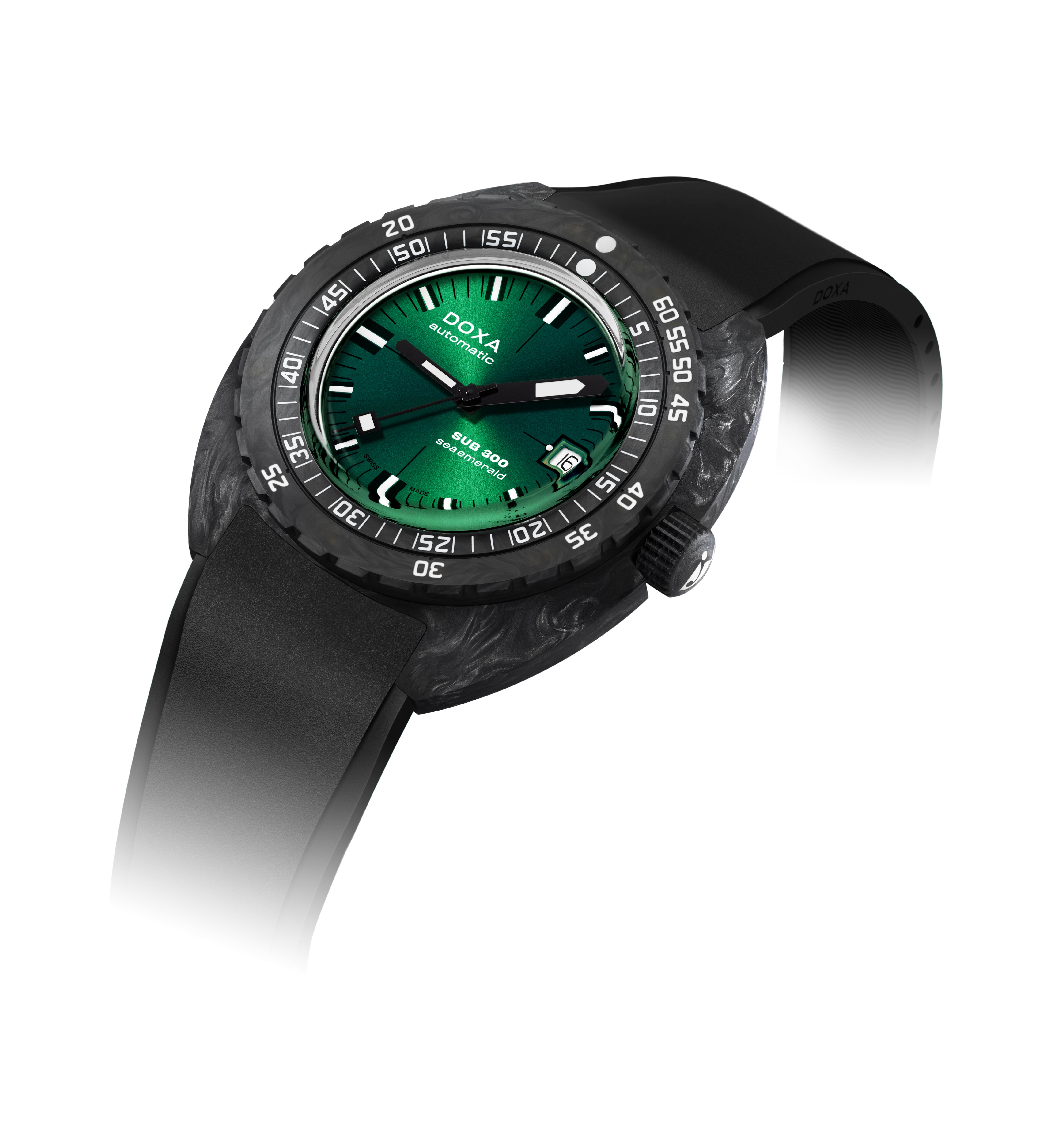 The SUB 300 in carbon is available in 8 colours with the choice of a rubber strap in black or in the same colour as the dial. Featuring distinctive DOXA cues on both sides, the strap is fitted with a black PVD-treated folding clasp decorated with the exclusive DOXA fish symbol. It also has an adjustable diving extension to accommodate the thickness of a wet suit.