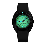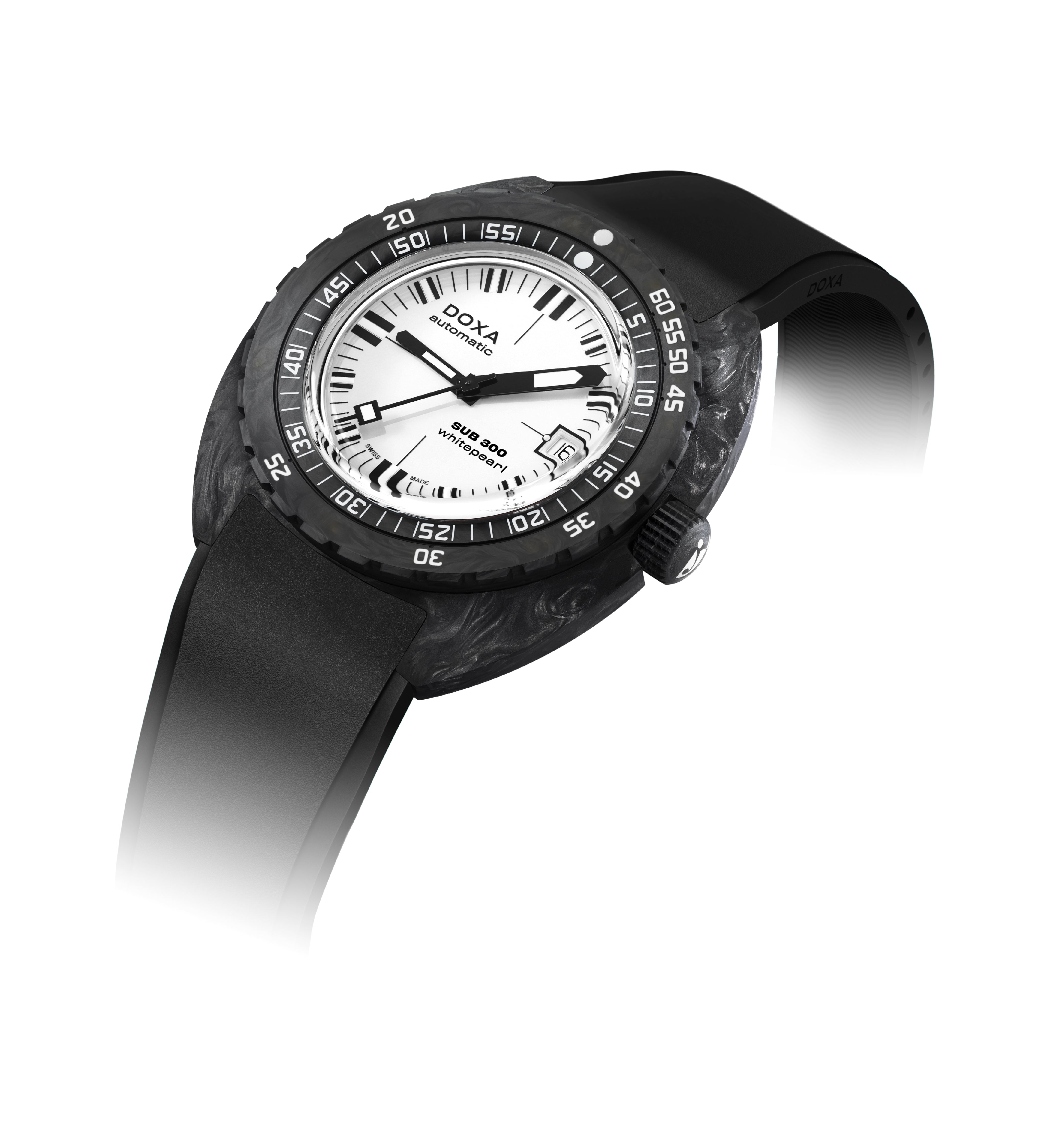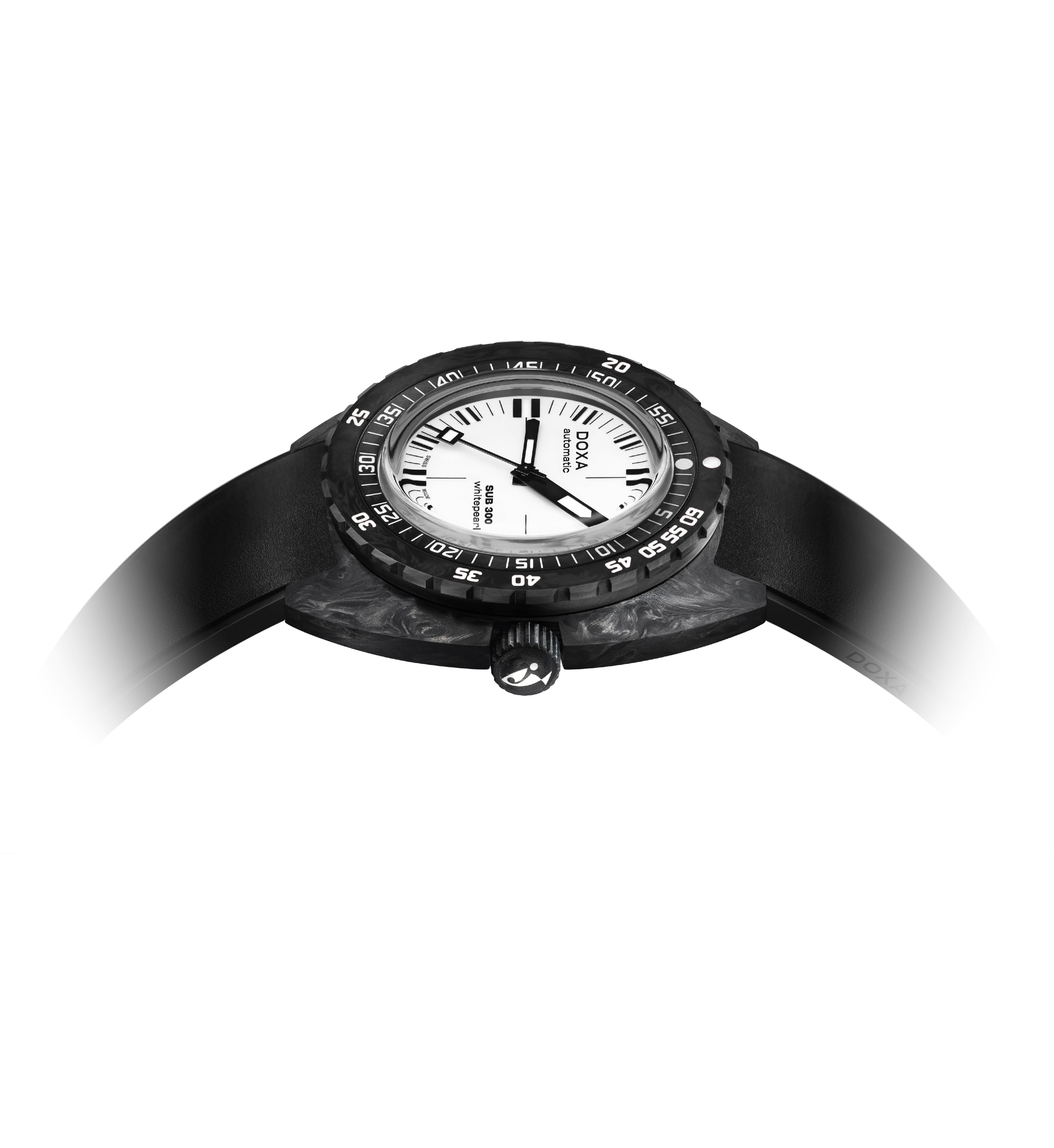 The SUB 300 in carbon is available in 8 colours with the choice of a rubber strap in black or in the same colour as the dial. Featuring distinctive DOXA cues on both sides, the strap is fitted with a black PVD-treated folding clasp decorated with the exclusive DOXA fish symbol. It also has an adjustable diving extension to accommodate the thickness of a wet suit.