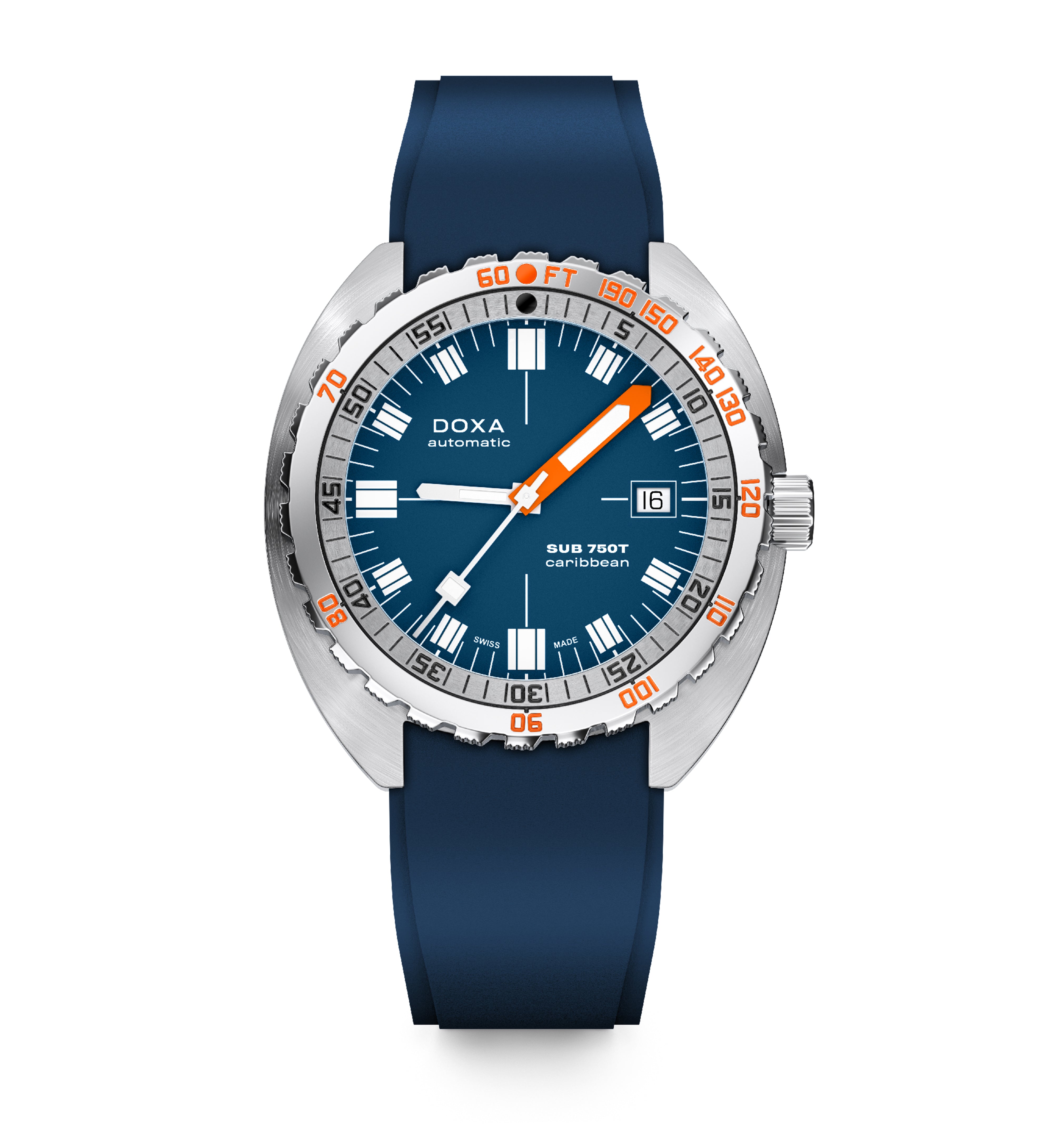 Today, DOXA brings this icon into the present with a completely re-imagined design. The new SUB 750T preserves the DNA of the original with its bold presence, uncompromising build, and rugged reliability while introducing a slimmer and more modern silhouette. The redesigned case remains substantial at 45.00 x 47.00 mm but has been refined to 11.95 mm in thickness, making it lighter, more comfortable, and better suited to contemporary wear.