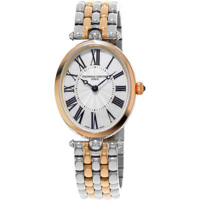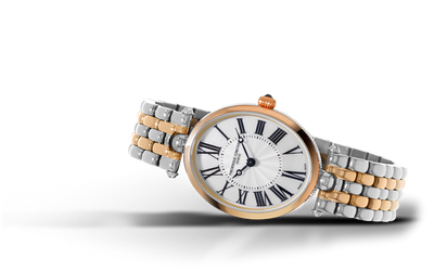 Depuis le jour de la naissance de notre société, Frédérique Constant s'est attachée avec passion à produire des montres d'une immense beauté classique et intemporelle ; des montres aussi glamour et élégantes que fiables et technologiquement avancées. La toute nouvelle gamme Classics Art Déco Oval, qui comprend pas moins de neuf nouveaux modèles, a porté le concept de "luxe abordable", sur lequel nous avons été fondés, à des niveaux totalement nouveaux, et c'est peut-être aussi bien. Lorsque les dames verront les caractéristiques spectaculaires du design disponibles dans toute la gamme, il est tout à fait possible qu'elles voudront plus d'un modèle Art Déco dans leur boîte à bijoux.Chaque montre de la gamme est équipée d'un mouvement à quartz de calibre FC- 200, avec sept rubis et une durée de vie de la pile qui donne plus de cinq ans (63 mois) de précision inégalée. L'étonnant boîtier en trois parties, hautement poli et de forme ovale, s'adapte confortablement au poignet le plus petit, qui ne mesure que 30 mm x 25 mm. Parmi les autres caractéristiques communes à toute la gamme, citons le verre saphir convexe qui protège le cadran, les fonctions des heures et des minutes, ainsi que la merveilleuse et délicate décoration guillochée au centre du cadran. Et ne vous laissez pas tromper par leur apparence délicate ; chaque montre Art Déco Oval est étanche jusqu'à 30 pieds sous le niveau de la mer. Que la dame préfère un boîtier en or jaune riche et brillant ou en acier inoxydable hautement poli ; qu'elle aime les chiffres arabes ou romains soigneusement appliqués à la main et polis ; qu'elle souhaite que la montre soit attachée à son poignet avec des bracelets en satin gris, satin brun, plaqué or jaune ou en acier inoxydable, elle trouvera les caractéristiques qu'elle désire dans toute la nouvelle gamme Art Déco Oval.