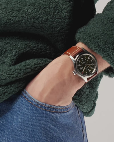 Inspirée de la montre originale des soldats, la Khaki Field Automatic allie héritage militaire et design contemporain, offrant une grande polyvalence aux pionniers modernes. Associant un cadran bleu marine soleil à un effet escargot sur la lunette des heures, le cadran reflète la lumière tout en offrant texture et profondeur. Conçu pour l'action et construit pour l'aventure, le calibre automatique exclusif H-10 offre jusqu'à 80 heures de réserve de marche, vous garantissant qu'il ne vous laissera pas tomber.