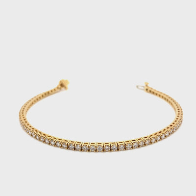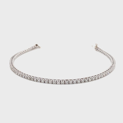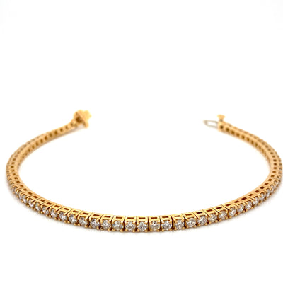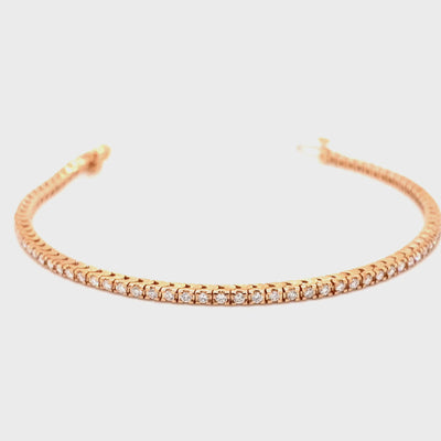 An essential in every women's jewellery box! 14k gallery set four-prong round diamond tennis bracelet with tongue and groove closure with one security hidden clasp. Perfect essential diamond tennis bracelet for everyday wear and special occasions. The bracelet is hand set in 14k in either white, rose or yellow gold options with total approximate carat weight options from 1.25ct to 7.00ct. The 1.25ct bracelet consists of 74 hand set stones, the 2ct bracelet consists of 79 hand set stones, the 3ct bracelet consists of 71 hand set stones, the 4ct bracelet consists of 65 hand set stones, the 5ct bracelet consists of 58 hand set stones, and  the 7ct bracelet consists of 52 hand set stones.