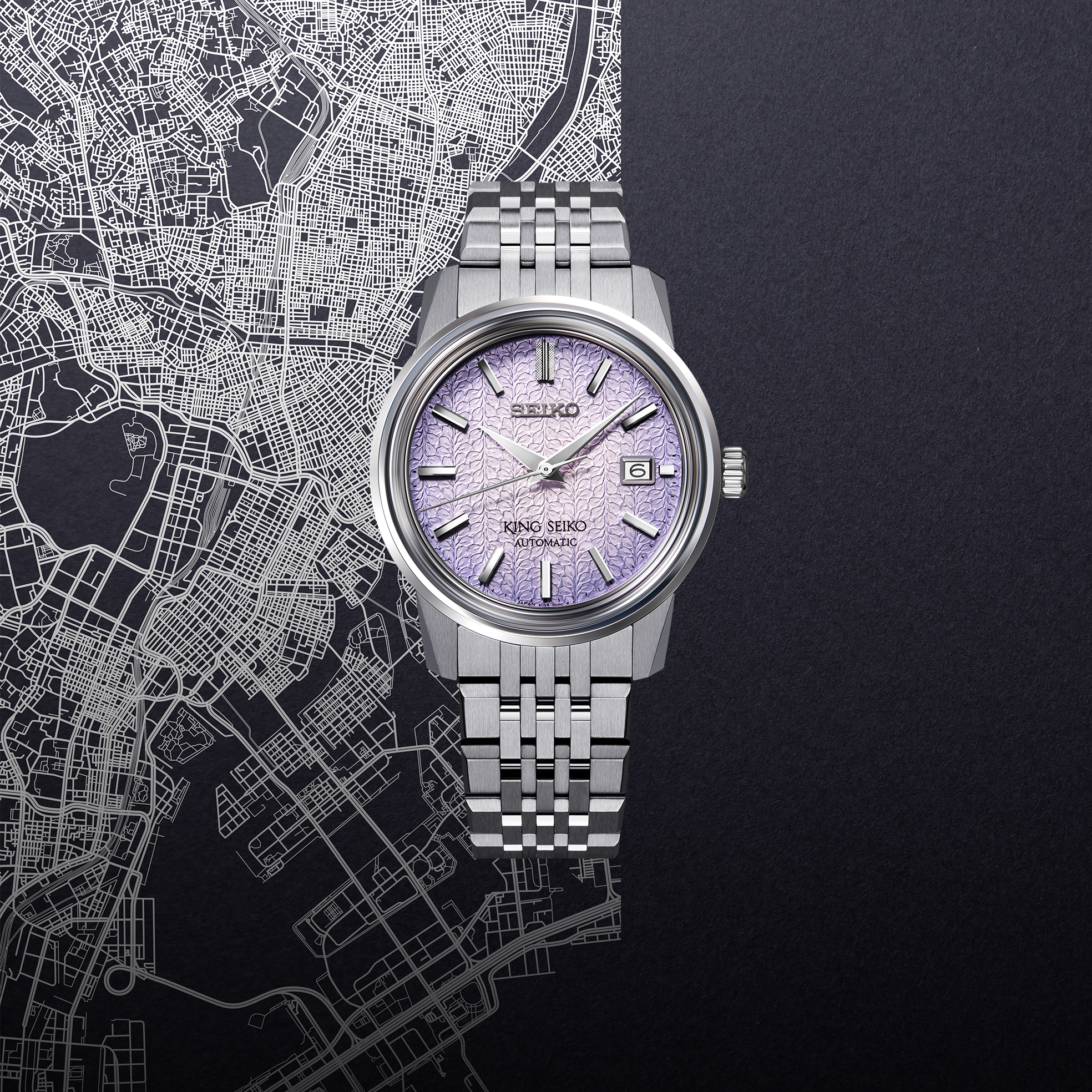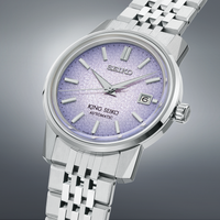 From the King Seiko Collection. First introduced in 1961, King Seiko became one of Seiko’s most technically innovative and stylish brands, noted for its sleek, dignified profile Reflecting traditional aspects of Japanese Ukiyo-e, a genre of art that flourished from the 17th through 19th centuries, the dial of this stunning timepiece expresses “Tenjin Fuji Violet,” dramatically showcasing a pale violet gradation and a wisteria flower pattern, inspired by the vibrant blooms at the Tenjin Shrine in Kameido, Japan, the birthplace of King Seiko. Echoing the 1965 original, the patterned light purple dial features diamond cut hands, meticulously cut dimensional indices with a separately carved 12 o’clock marker, and a date calendar. Designed for sophistication and comfort, this elegant timepiece is engineered with a slim 10.7mm case, as well as sharply delineated case and crystal edges. The 26-jewel 6L35 caliber movement, with a frequency of 28,800 vibrations per hour, a power reserve of approximately 45 hours, and manual winding capability, offers such features as a bi-directional winding system and rapid date change mechanism while maintaining a slender profile. Crafted of stainless steel, with super-hard coating and the combination of mirror and hairline finishing characteristic of the original King Seiko, as well as the King Seiko crest on caseback and crown, this elegant timepiece also offers a box shaped sapphire crystal with anti-reflective coating on the inner surface and a deployment clasp with push button release. 5 bar, 50M Water Resistant