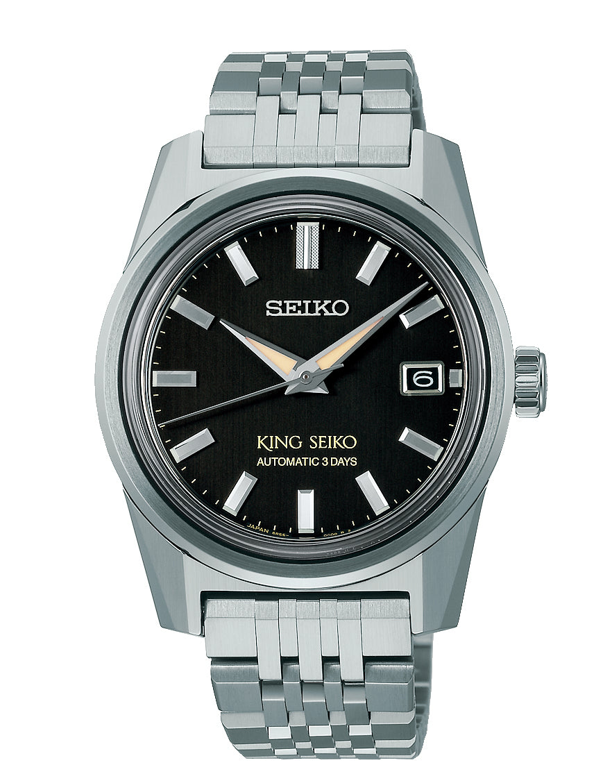 From the King Seiko Collection. Introduced in 1961 and in production until 1975, King Seiko became one of the company’s most technically innovative and stylish brands, noted for its sleek, dignified angularity. Paying tribute to the iconic original with updated styling and technology, this distinctive timepiece features a dial inspired by the pop culture and fashion favored by young Tokyo residents of the time. In a vintage aged black with vertical hairline finish and metallic texture, the retro look dial features a date calendar and LumiBrite hands and markers, topped by a box-shaped sapphire crystal with anti-reflective coating on the inner surface. For added versatility, the bracelet includes two levers on the end-piece that can be pressed for easy removal. The 24-jewel automatic movement, with an exceptional power reserve of approximately 72 hours, beats at a frequency of 21,600 vibrations per hour and provides manual winding capability. Crafted of stainless steel, with the combination of mirror and hairline finishing characteristic of the original King Seiko, as well as the King Seiko crest on the crown and screw-down case-back, this superbly wearable watch also includes a deployment clasp with push button release. 10 bar, 100M Water Resistant.