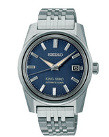 From the King Seiko Collection. Introduced in 1961 and in production until 1975, King Seiko became one of the company’s most technically innovative and stylish brands, noted for its sleek, dignified angularity. Paying tribute to the iconic original with updated styling and technology, this distinctive timepiece features a dial inspired by the pop culture and fashion favored by young Tokyo residents of the time. In a vintage aged blue with vertical hairline finish and metallic texture, the retro look dial features a date calendar and LumiBrite hands and markers, topped by a box-shaped sapphire crystal with anti-reflective coating on the inner surface. For added versatility, the bracelet includes two levers on the end piece that can be pressed for easy removal. The 24-jewel automatic movement, with an exceptional power reserve of approximately 72 hours, beats at a frequency of 21,600 vibrations per hour and provides manual winding capability. Crafted of stainless steel, with the combination of mirror and hairline finishing characteristic of the original King Seiko, as well as the King Seiko crest on the crown and screw-down case-back, this superbly wearable watch also includes a deployment clasp with push button release. 10 bar, 100M Water Resistant.