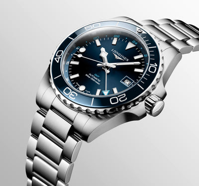 L'HydroConquest GMT se distingue également par son boîtier en acier inoxydable de 41 mm de diamètre avec fond et couronne vissés. Ce modèle est doté d'une nouvelle lunette unidirectionnelle crantée en céramique noire avec capsule luminescente. Ce cadran est vert. Cette version est proposée avec un bracelet en acier inoxydable ou en caoutchouc bleu.