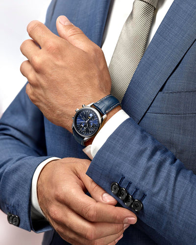 Boîtier en acier inoxydable de 40 mm, mouvement automatique avec calendrier annuel et complication des phases de lune, cadran bleu soleil.