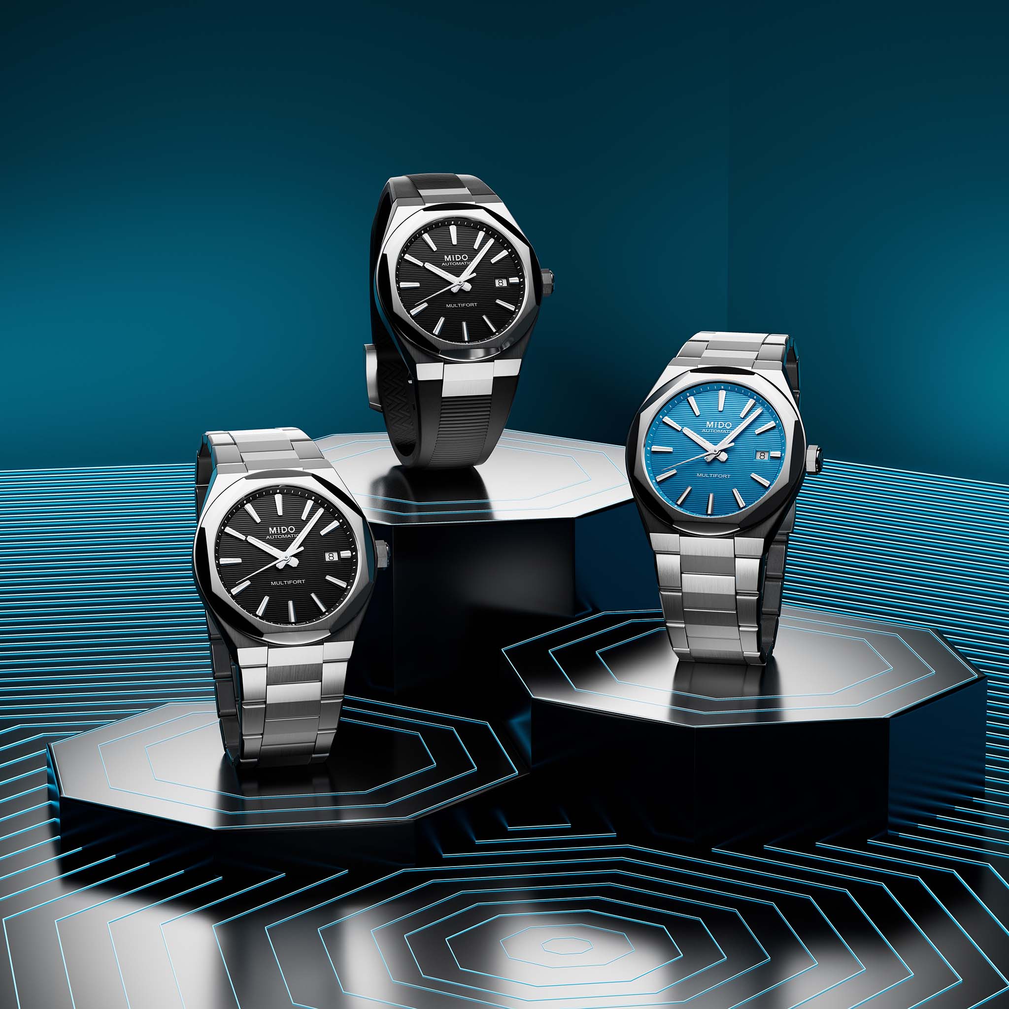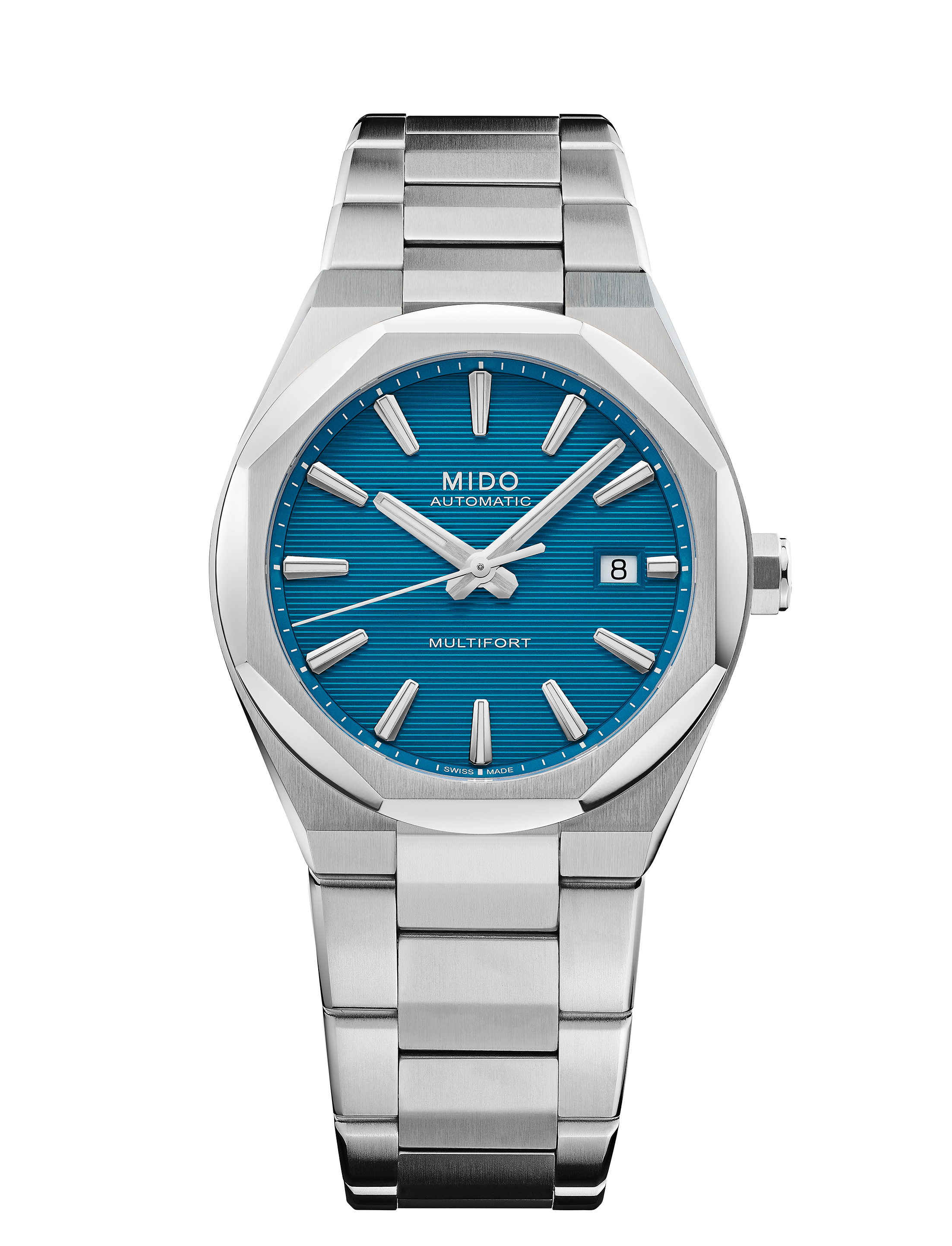 With its clean lines, balanced 40 mm case and distinctive octagonal bezel, the Multifort 8 One Crown showcases a bold and contemporary design. Its dial, structured with horizontal grooves, plays with rhythm and depth, while Super-LumiNova® ensures perfect legibility. A double-sided anti-reflective sapphire crystal protects the dial, enhanced by a satin-finished steel case with polished edges. Powered by the Caliber 80 – a Swiss automatic movement with extended autonomy, visible through the transparent case back – this timepiece reflects MIDO’s vision of TECHNOMETRY: a harmonious fusion of technology and geometry. Robust, precise and stylish, the Multifort 8 One Crown is made for those who demand excellence with character.