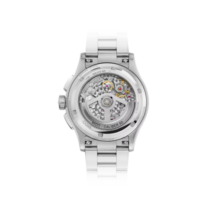 The Multifort Skeleton Chronograph is the true embodiment of rarity, cutting-edge technology, and exceptional craftsmanship. This sophisticated and precise Swiss automatic movement is the heart of this sports watch, with advanced chronograph functionality. The skeleton dial, with its meticulously crafted hands, reveals the mechanical complexity of the watch while ensuring optimal readability through sapphire glass, treated with anti-reflective coating on both sides. The transparent case back showcases the beauty of the automatic caliber 60 A05.951 skeleton chronograph, developed and implemented by MIDO for the very first time.