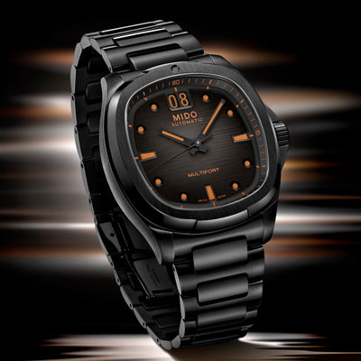 A brilliant flashback! Born from MIDO's extraordinary heritage, the TV-shaped case returns to centre stage for the Multifort TV Big Date, as intense as it is precise, thanks to its formidable mechanical movement. The modern and dynamic design of this Swiss watch is highlighted by a striking dial and, along with its distinctive function: the BIG DATE at 12 o'clock. Its formidable latest-generation automatic movement, Caliber 80, is equipped with a high-tech balance spring in Nivachron™, which offers outstanding resistance to shocks and magnetic fields.