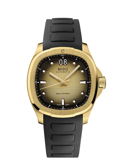 A brilliant flashback! Born from MIDO's extraordinary heritage, the TV-shaped case returns to centre stage for the Multifort TV Big Date, as intense as it is precise, thanks to its formidable mechanical movement. The modern and dynamic design of this Swiss watch is highlighted by a striking dial and, along with its distinctive function: the BIG DATE at 12 o'clock. Its formidable latest-generation automatic movement, Caliber 80, is equipped with a high-tech balance spring in Nivachron™, which offers outstanding resistance to shocks and magnetic fields.