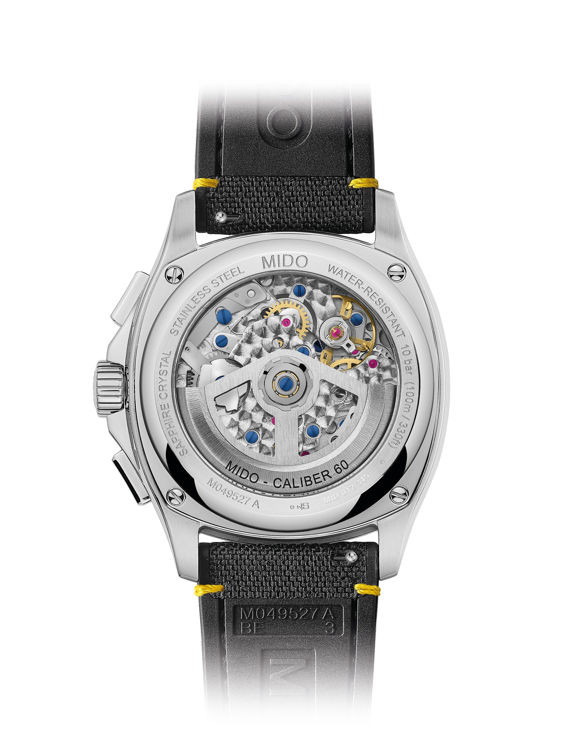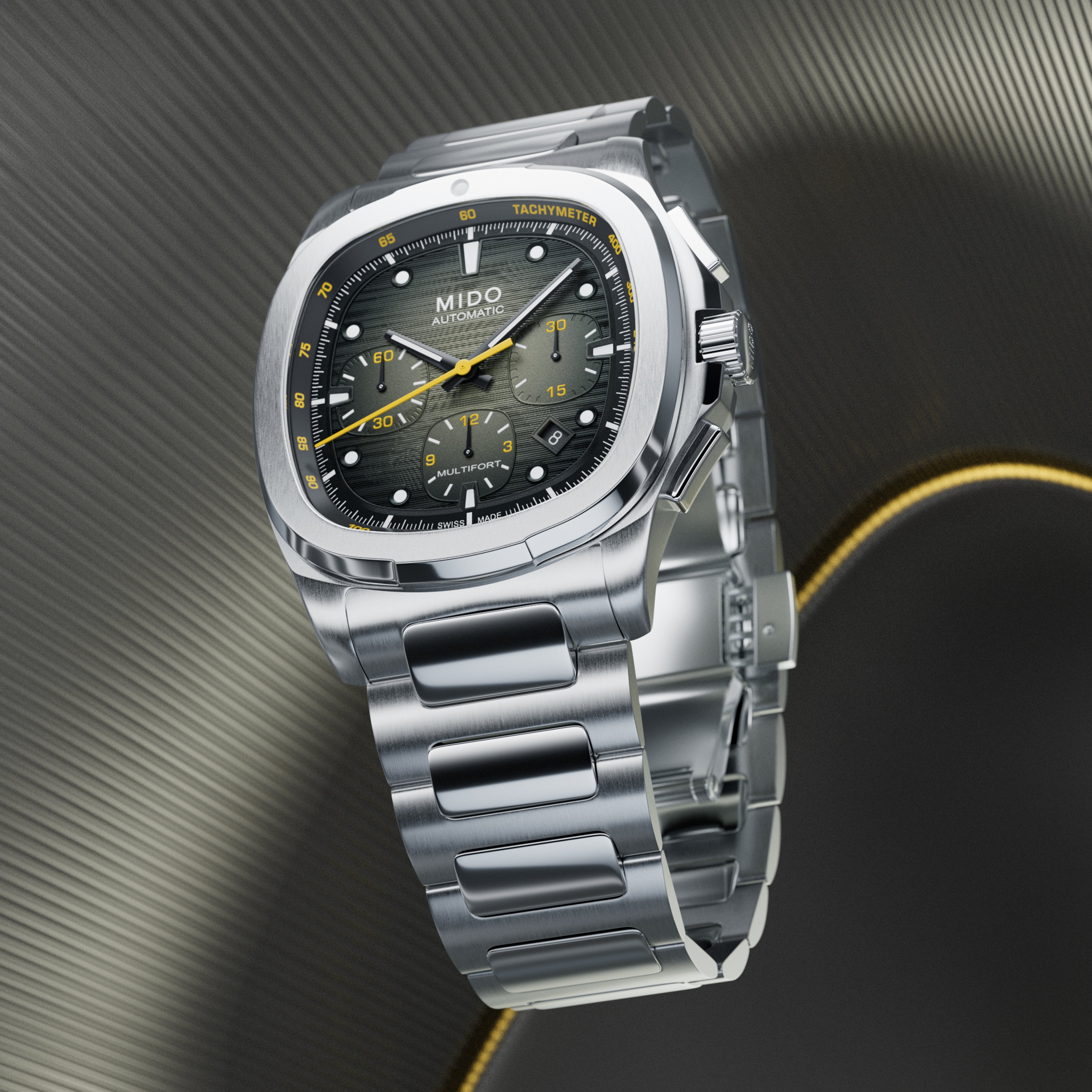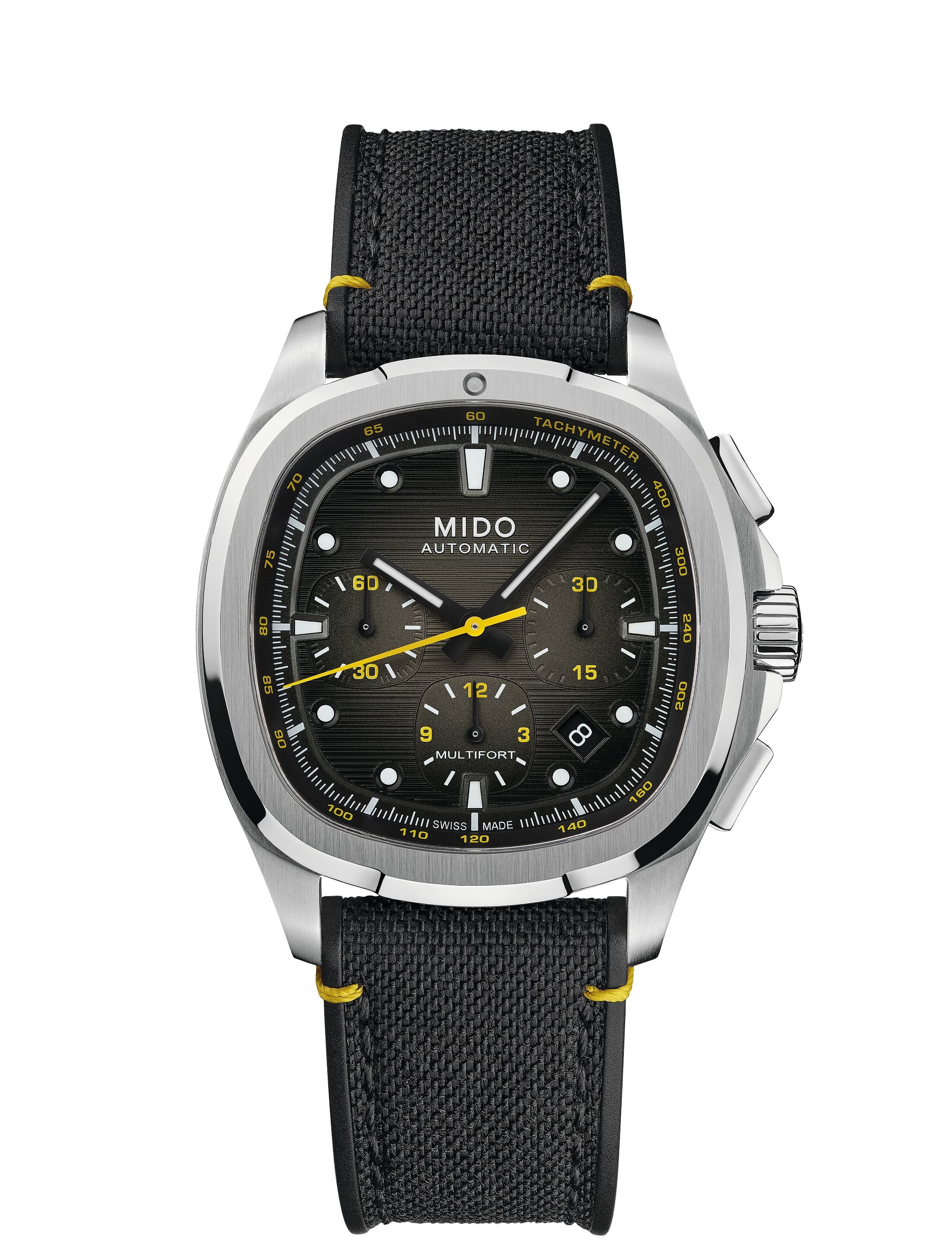 An eye-catching design! True to MIDO’s bold spirit, the Multifort TV Chronograph asserts its character with a uniquely styled TV-shaped case. Its contemporary silhouette is enhanced by a horizontally brushed dial, brought to life by two subtly integrated counters and contrasting details that highlight its personality. At its core ticks the Caliber 60 – a high-precision Swiss automatic movement – delivering up to 60 hours of power reserve. Technical, expressive, and perfectly balanced, this timepiece is built to accompany every standout moment of daily life. It is delivered with an additional strap, offering even greater versatility and comfort.