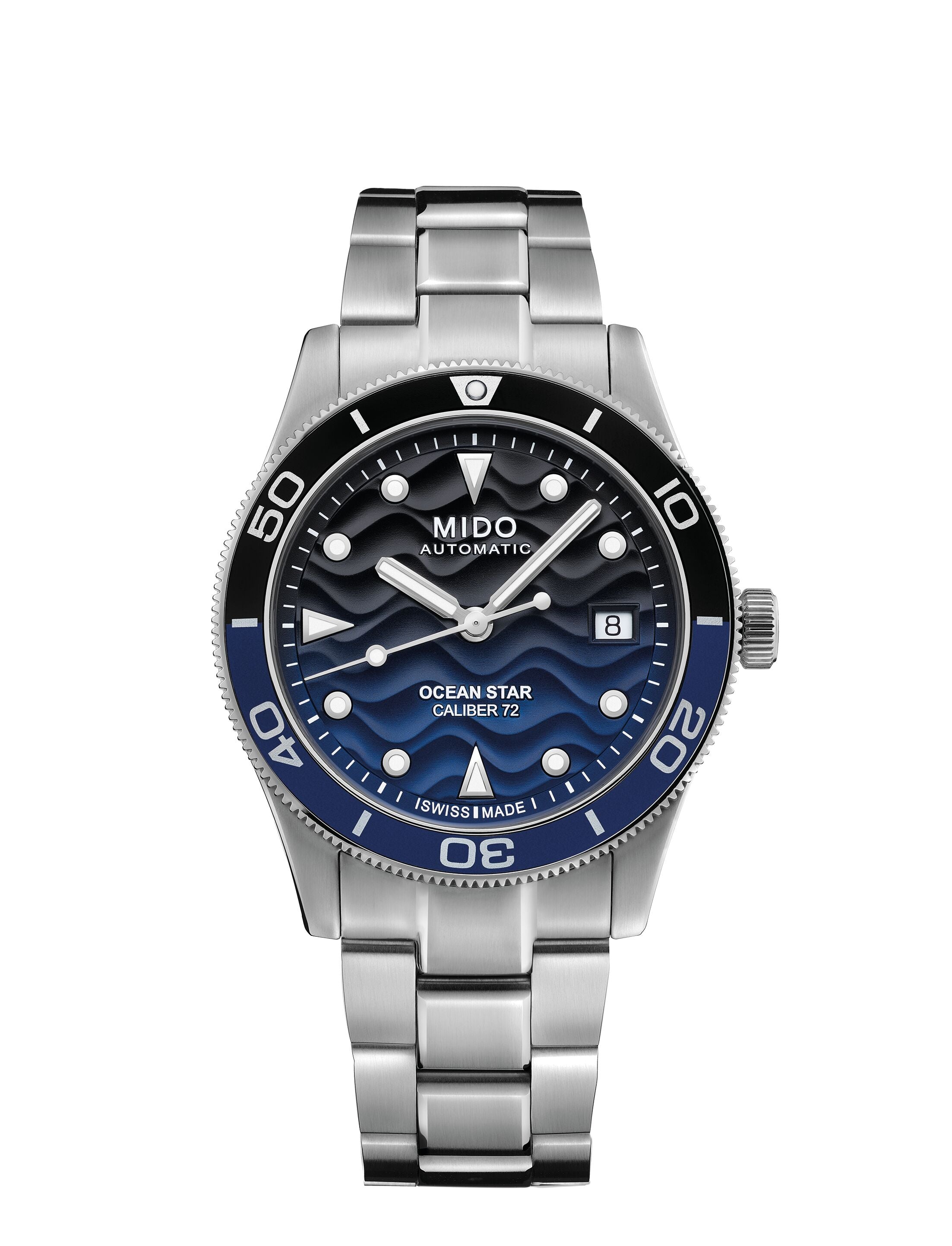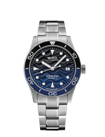 39mm stainless steel case, automatic movement with 72 hour power reserve, blue & black gradient wave dial, stainless steel bracelet