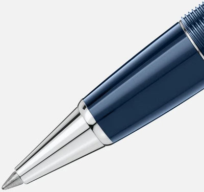 La collection Meisterstück Le tour du monde en 80 jours s'inspire du célèbre roman d'aventure de Jules Verne. Le stylo roller Le Grand en résine précieuse bleue s'inspire de la première partie du voyage. Le personnage principal voyage, principalement en bateau à vapeur, de Londres à Bombay, en traversant la Méditerranée et le canal de Suez. Le capuchon présente un motif fraisé des éléments clés du roman : les vagues de l'océan, les couleurs des cartes et un cartouche avec un bateau à vapeur au laser. La longueur du voyage est inscrite en relief sur le dessus de la casquette : 18 jours de Londres à Bombay et 80 jours au total.