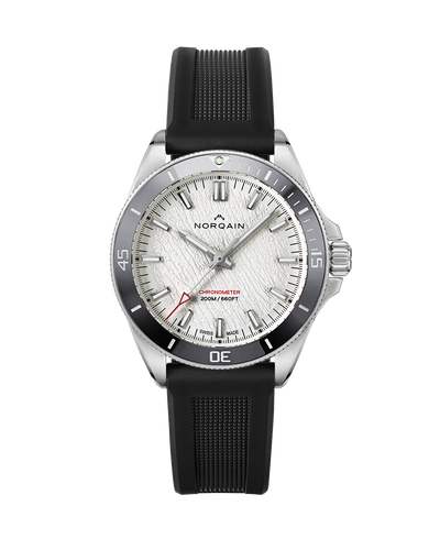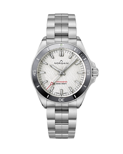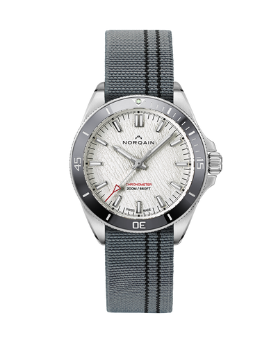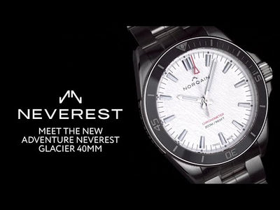 L'Adventure NEVEREST Glacier de 40 mm à remontage automatique présente un aspect argenté captivant - du boîtier en acier brossé et satiné à la lunette et au cadran gris. Des accents rouges comme le repère zéro sur l'anneau gris de la lunette, l'aiguille centrale des secondes et l'inscription "Chronomètre" se détachent sur le cadran blanc craquelé. Les fissures ressemblent aux crevasses déchiquetées de la cascade de glace Khumbu, l'étape la plus dangereuse de l'ascension du sommet de l'Everest. Les marqueurs et les aiguilles des heures, des minutes et des secondes sont recouverts de Superluminova X1, qui est 60 % plus résistant que le Superluminova standard. La "Glacier" est étanche à 200 mètres et est équipée du calibre NN20/1 de lamanufactureNORQAIN , visible à travers le fond du boîtier en verre saphir.
