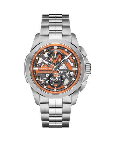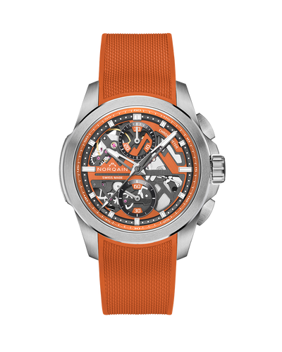 L'Independence Skeleton Chrono est équipé du calibre de manufacture NORQAIN 8K, un mouvement chronographe flyback squeletté exclusif de haute performance inspiré des plus hautes montagnes du monde. Ce modèle est le premier chronographe de la collection Independence. Il ne sera pas limité, si ce n'est par la production. Dans un premier temps, seuls 300 calibres 8K ont été commandés pour l'Independence Skeleton Chrono Steel, un deuxième lot étant attendu pour Watches and Wonders Geneva 2025.
