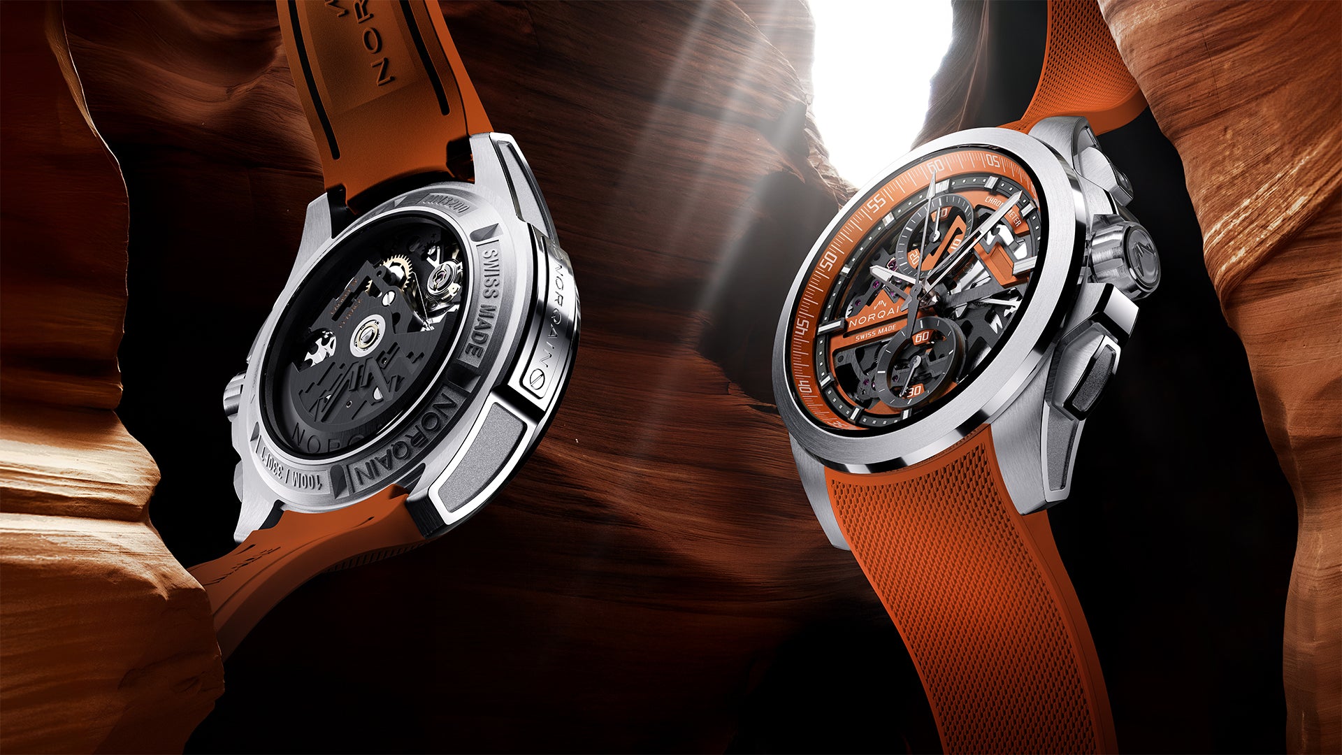 42mm stainless steel case, automatic COSC certified 8K in-house Chronometer flyback chronograph movement, orange skeleton dial.