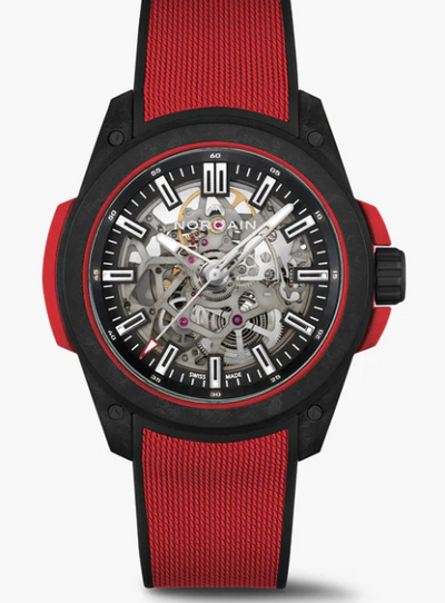 42mm black Norteq case, automatic movement, skeleton dial with red accents, red rubber strap with deployant clasp. Limited edition of just 25 pieces.