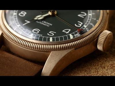 Boîtier en bronze de 40 mm, mouvement automatique, cadran vert, bracelet en cuir brun foncé.